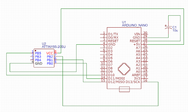2. Connect the AtTiny85 to the Arduino as shown on the image below