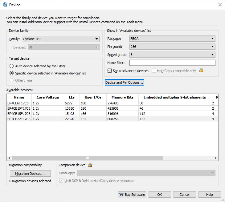 4. Click on the Flash Loader in the bottom table and click on the Add Device... button. That would open the Select Devices dialog. Choose Cyclone IV E and EP4CE22: