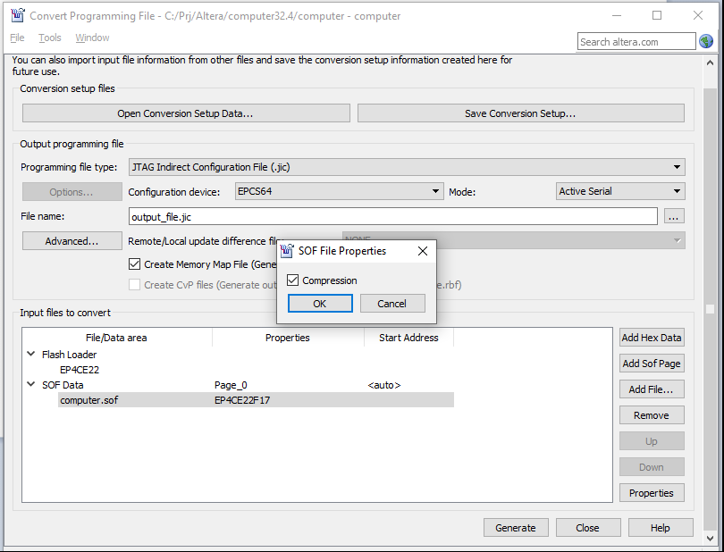 6. Click on the chosen SOF file in the table (in my example, the computer.sof file) and click on the Properties. Turn on the compression: