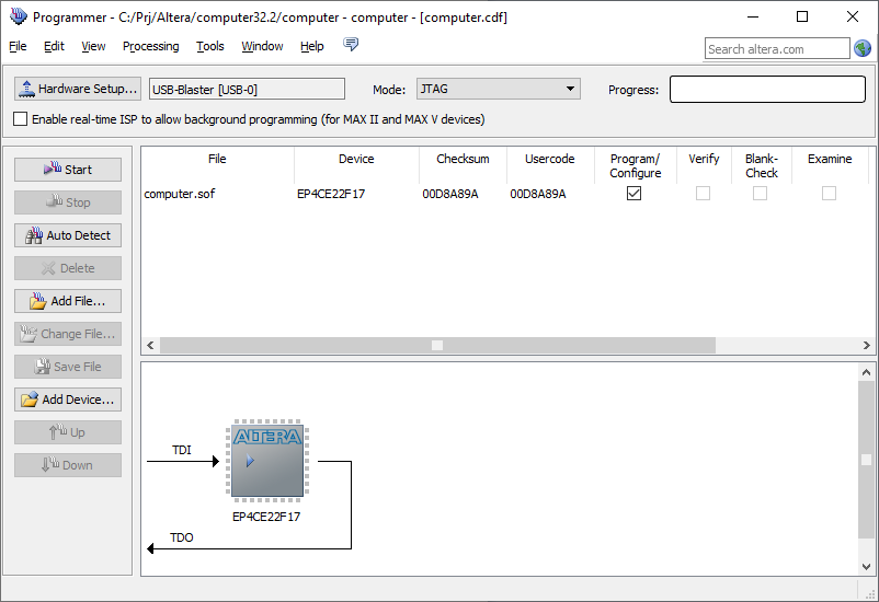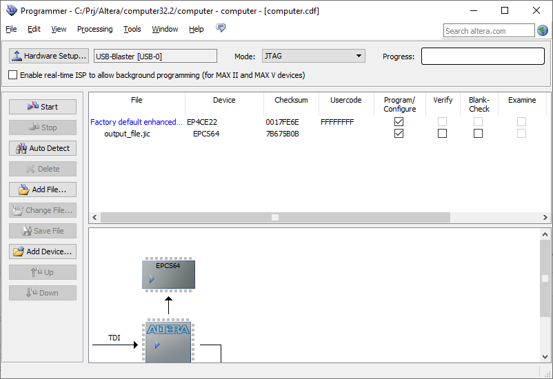 7. After that start the Programmer, delete the SOF file (if existed), and add the JIC file (click on the Add File... button). Make sure that both Program/Configure checkboxes are turned on: